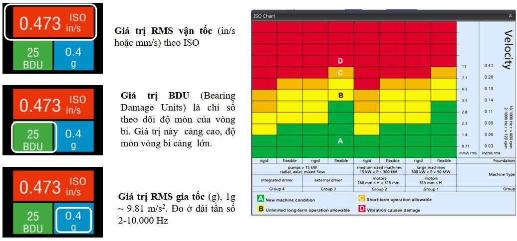 - RMS: Giá trị rung tổng thể thiết bị (vận tốc, biên độ)
