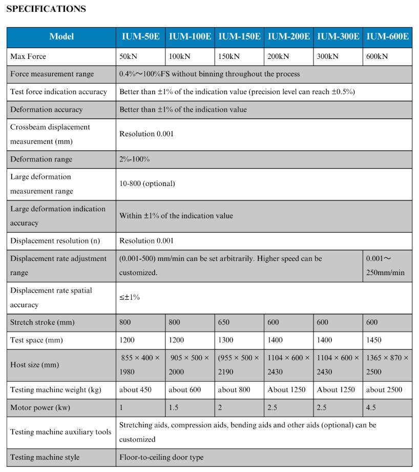 Thông số kỹ thuật Máy đo độ bền kéo nén điện tử IMS IUM-20E, IUM-50E, IUM-100E, IUM-150E, IUM-200E, IUM-300E, IUM-600E