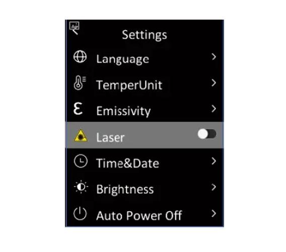 Trong menu, nhấn nhanh nút Lên / Xuống để chọn Cài đặt, sau đó nhấn nhanh nút OK để vào menu con. Trong menu con, nhấn nhanh nút Lên / Xuống để chọn Laser và nhấn nhanh nút OK để bật / tắt laser.