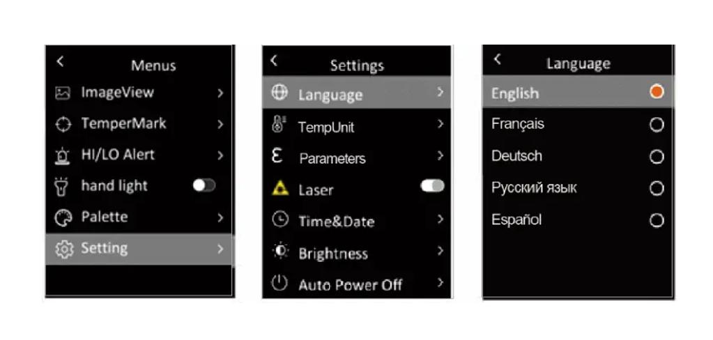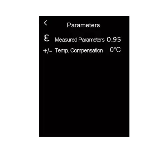 Trong menu, nhấn nhanh nút Lên / Xuống để chọn cài đặt, sau đó nhấn nhanh nút OK để vào menu con. Trong menu con, nhấn nhanh nút LÊN / Xuống để chọn Emissvity hoặc Temp.Comp và nhấn nhanh nút OK để cài đặt.