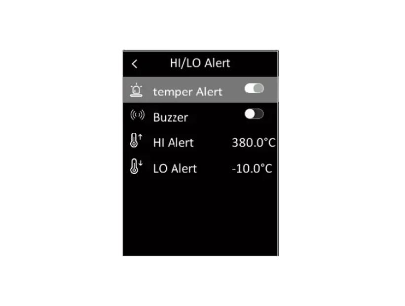 Trong menu, nhấn nhanh nút Lên / Xuống để chọn Cảnh báo HI / LO, sau đó nhấn nhanh nút OK để vào giao diện cài đặt cảnh báo. Cảnh báo nhiệt độ, Buzzer, Cảnh báo HI và Cảnh báo LO có thể được đặt trong giao diện này.