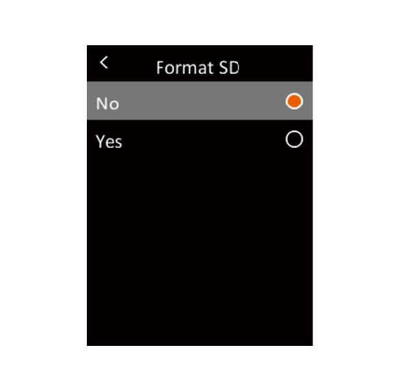 Trong menu, nhấn nhanh nút Lên / Xuống để chọn Cài đặt, sau đó nhấn nhanh nút OK để vào menu con. Trong menu con, nhấn nhanh nút Lên / Xuống để chọn Định dạng SD và nhấn nhanh nút OK để vào giao diện cài đặt. Nhấn nút OK, chọn Có hoặc Không.