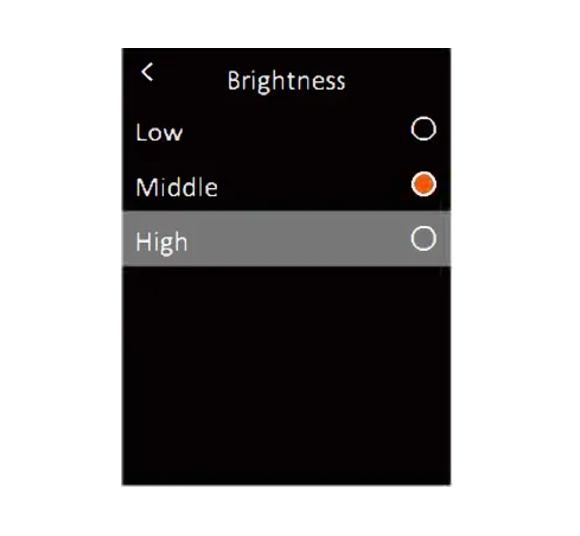 Trong menu, nhấn nhanh nút Lên / Xuống để chọn Cài đặt, sau đó nhấn nhanh nút OK để vào menu con. Trong menu con, nhấn nhanh nút Lên / Xuống để chọn Độ sáng và nhấn nhanh nút OK để vào giao diện cài đặt. Độ sáng có thể là Thấp, Trung bình hoặc Cao