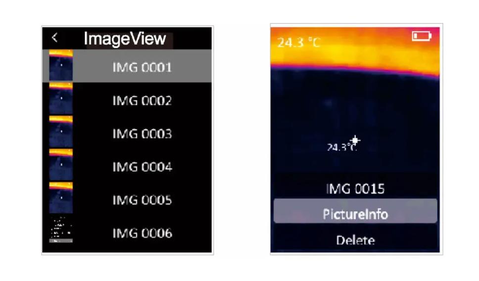 Trong menu, chọn Hình ảnh View, sau đó nhấn nhanh nút OK để nhập hình ảnh viewgiao diện ing. Nhấn nút Lên / Xuống để chọn ảnh. Nhấn nút OK hai lần để view Thông tin hình ảnh hoặc Xóa hình ảnh.