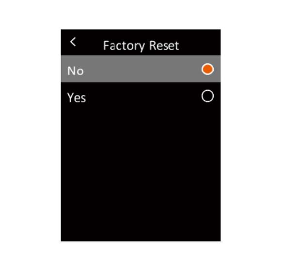Trong menu, nhấn nhanh nút Lên / Xuống để chọn Cài đặt, sau đó nhấn nhanh nút OK để vào menu con. Trong menu con, nhấn nhanh nút Lên / Xuống để chọn Khôi phục cài đặt gốc và nhấn nhanh nút OK để vào giao diện cài đặt. Nhấn nút OK, chọn Có hoặc Không.