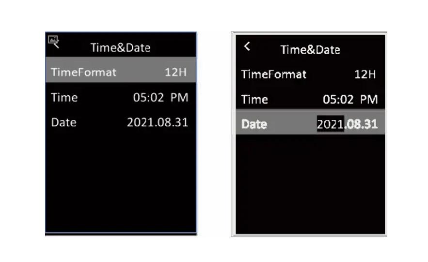 Trong menu, nhấn nhanh nút Lên / Xuống để chọn Cài đặt, sau đó nhấn nhanh nút OK để vào menu con. Trong menu con, nhấn nhanh nút Lên / Xuống để chọn Giờ & Ngày, và nhấn nhanh nút OK để vào giao diện cài đặt. Định dạng thời gian có thể chuyển đổi giữa 12 giờ và 24 giờ. Nhấn nút Lên / Xuống để điều chỉnh giá trị của ngày và giờ, và nhấn nhanh nút OK để xác nhận.