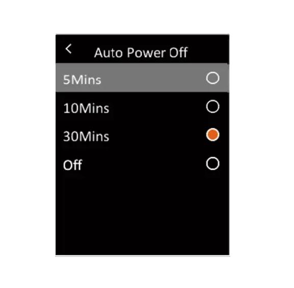 Trong menu, nhấn nhanh nút Lên / Xuống để chọn Cài đặt, sau đó nhấn nhanh nút OK để vào menu con. Trong menu con, nhấn nhanh nút Lên / Xuống để chọn Tự động tắt nguồn và nhấn nhanh nút OK để vào giao diện cài đặt. Trong giao diện này, người dùng có thể cài đặt nguồn tự động của f time (5/10/30 phút) hoặc tắt chức năng tự động tắt nguồn.